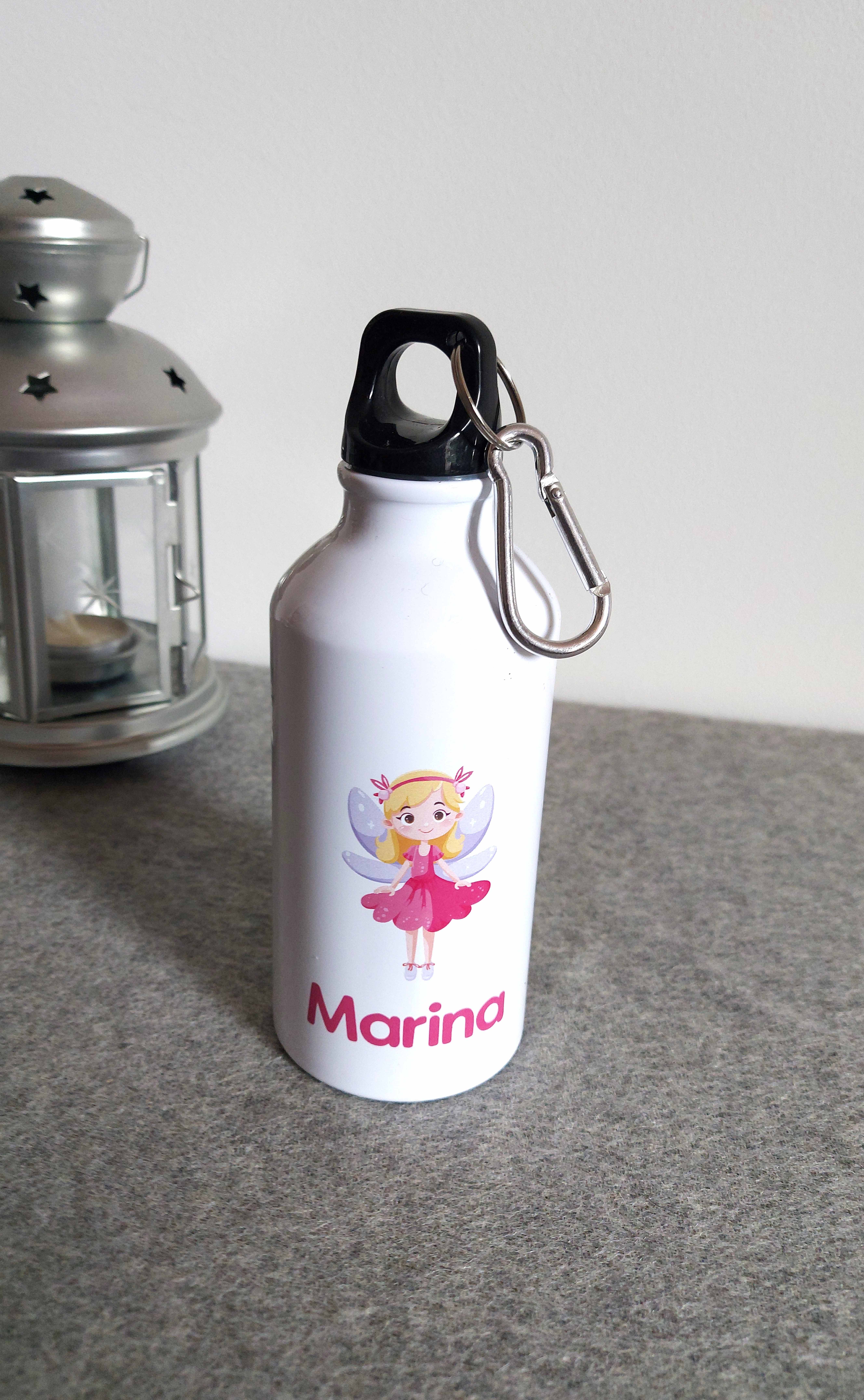 Para llevar el agua al cole, al parque, al monte o la playa y de viaje, las botellas de aluminio personalizadas a color, con el nombre de tu peque, son la solución perfecta. Puedes llevarla dentro de su mochilita o fuera, colgando de su mosquetón. Capacidad 400 ml. Este modelo con una dulce hada con el cabello rubio les encanta. Indícanos su nombre en la casilla Personalízame. Si prefieres un modelo totalmente a tu gusto, escríbenos a web@mregalos.com y la diseñaremos encantados para ti.