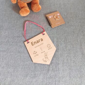 Juego de 7 placas cumplemes en forma de corazón personalizadas en madera de haya, grabadas a láser por ambas caras con el número de mes de vida del bebé, y una con su nombre.