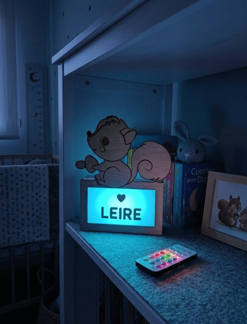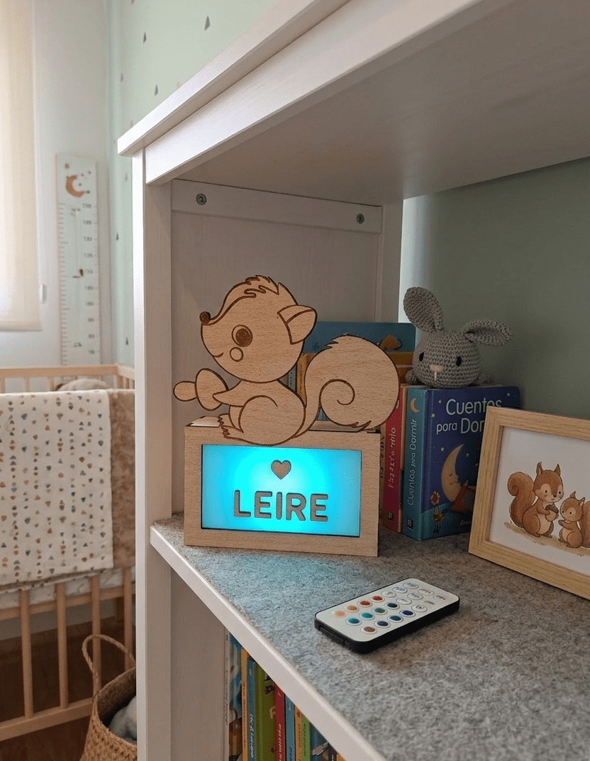 Lámpara de madera personalizada con el nombre de tu peque y una ardilla traviesa.