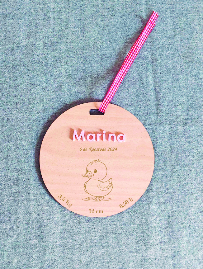 El nacimiento de tu bebé es un momento que os marcará siempre, recuerda cada detalle de una manera muy especial con nuestro natalicio en madera de haya. Decora su habitación con esta plaquita. Perfecto para tu bebé o para regalar a cualquier recién nacido. Cuélgalo en su cunita, en la pared, en la puerta de la habitación o de su armario. Natalicio en madera grabado a láser con forma circular y un gracioso patito y el nombre del bebé en color. Puedes elegir el color del metacrilato para el nombre: blanco, rosa pastel, naranja pastel, amarillo pastel, verde menta, azul cielo, naranja, rojo y azulón. Indícanos en la casilla Personalízame: su nombre, fecha de nacimiento, hora, medida, peso y color elegido. Dimensiones 19 cm de diámetro.