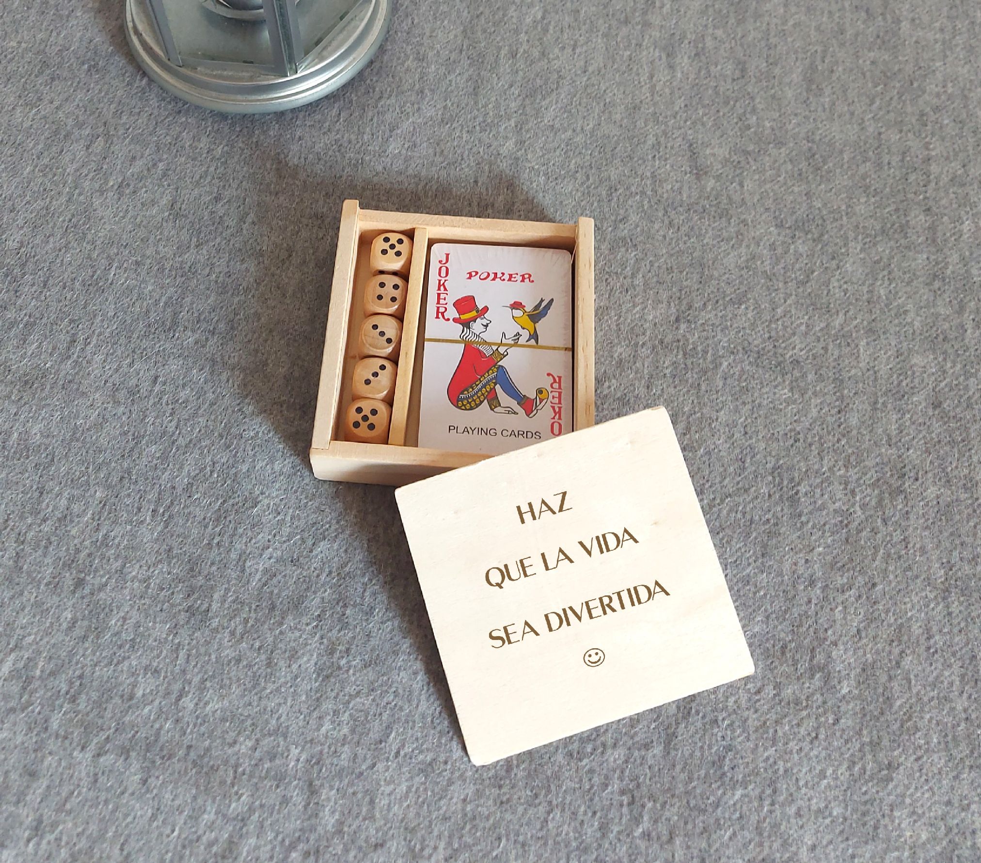 Cajita de madera personalizada con una frase de vuestra elección, con cartas y dados para jugar al Póker