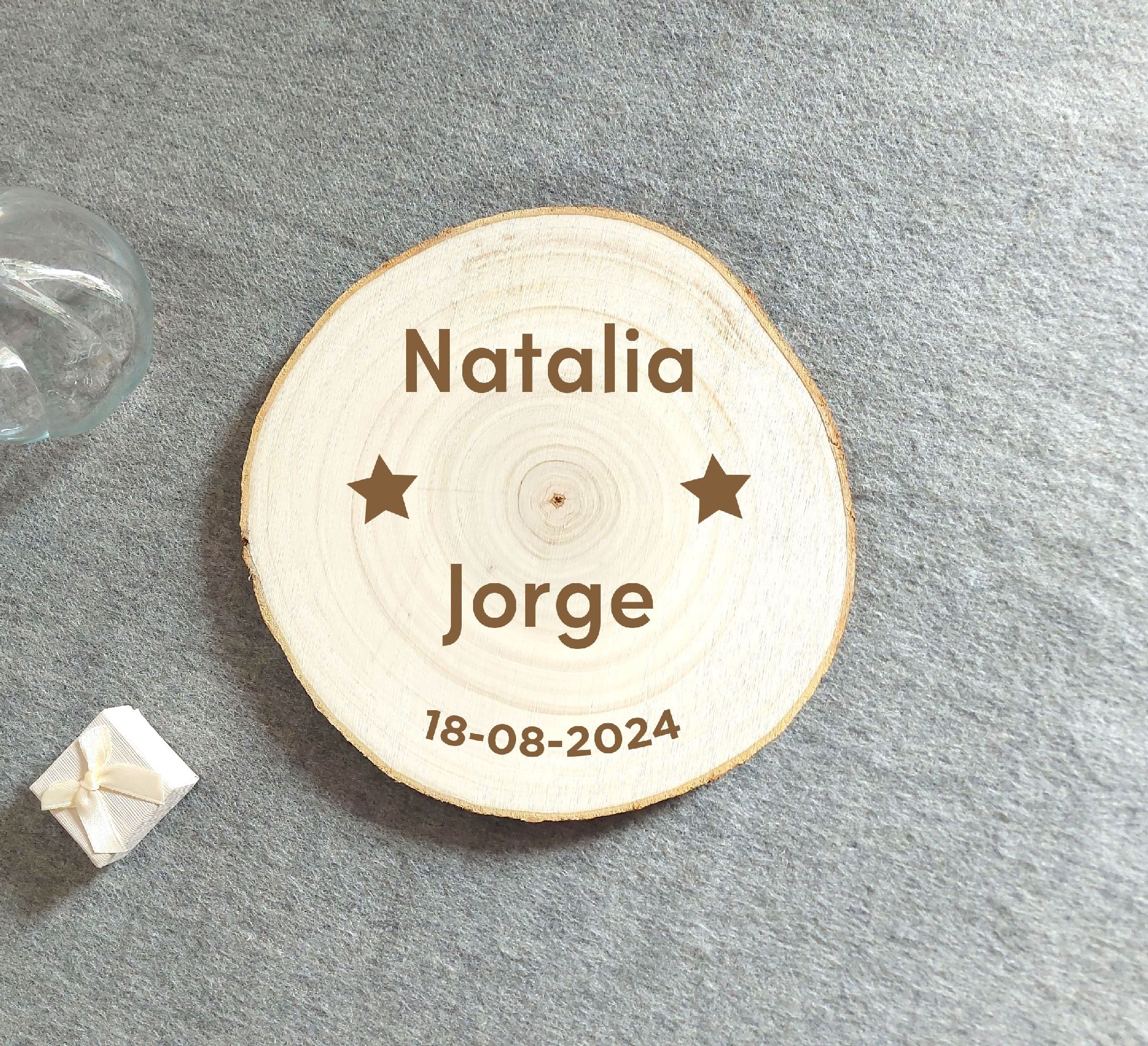 Si quieres que tu boda sea diferente, las Rodajas de árbol son una manera preciosa de llevar vuestras alianzas al altar. Las hacemos con 2 agujeritos para pasar el cordoncito que usarás para atarlas. Si quieres un modelo sencillo este es tu Modelo. Tienen un diámetro entre 20-22 cm. Indíca el texto a incluir en la casilla Personalízame. Si quieres un modelo totalmente a tu medida, escríbenos a web@mregalos.com y lo diseñaremos encantados para ti